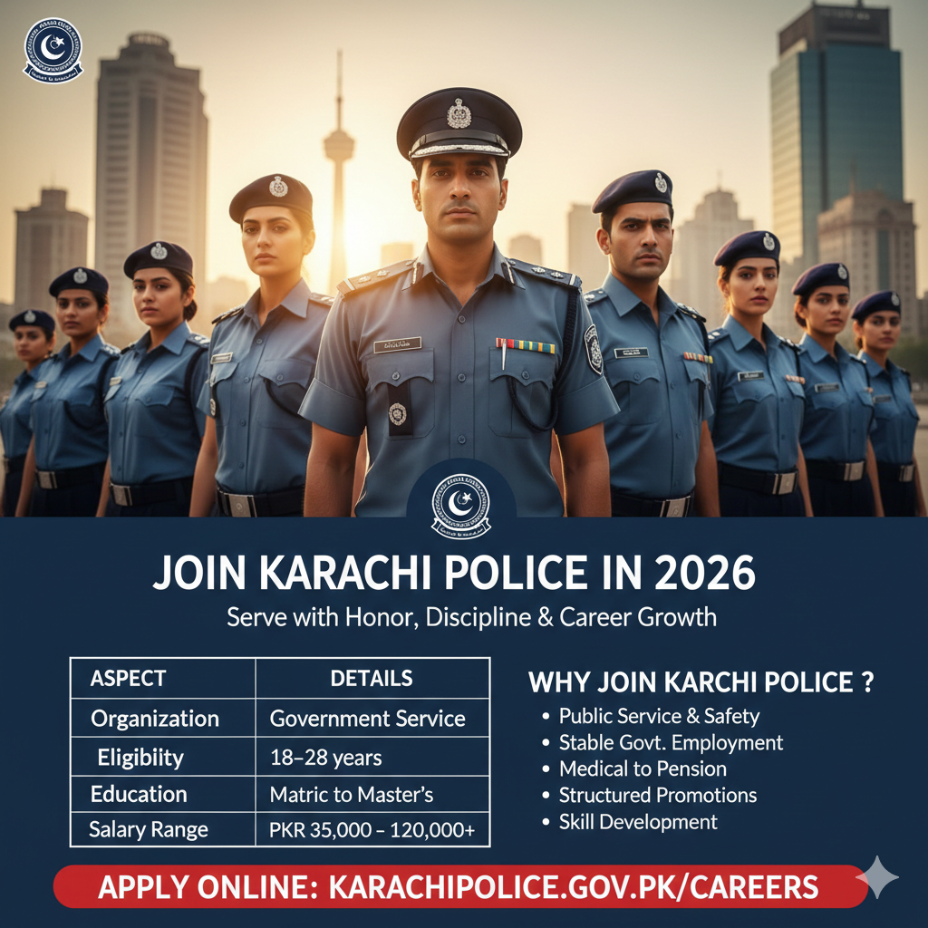 Joining Karachi Police is a prestigious career path for those who want to serve the public, maintain law and order, and develop a structured professional life. The Karachi Police Department are offers stable employment, competitive salaries, and opportunities for career growth, making it a top choice for youth in 2026.
